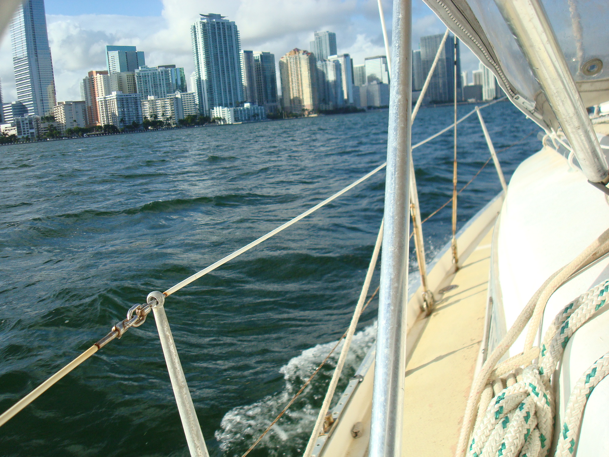 A couple of minutes later we are cruising in Biscayne Bay, pass a team of suicidal windsurfers in colorful suits and acrobatic abilities, and then the channel narrows. Our main is up with an impromptu reefing system that weathers the strengthening wind; it took forever for M and CH to put it up after we realized that there’s no reefing system installed.