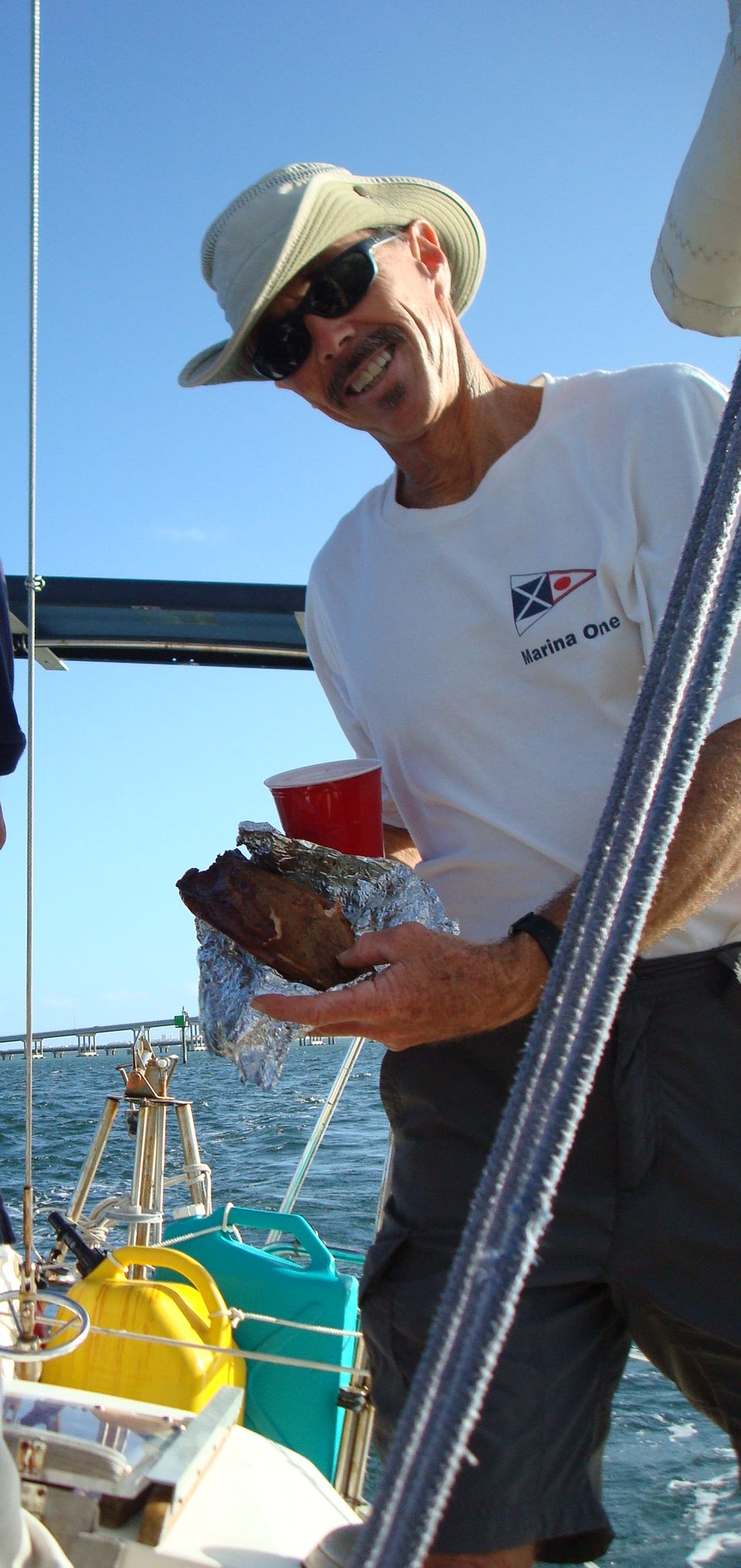 When we have the inlet in sight, CH pulls out his famous home-made smoked mullets, wrapped in aluminum foil.
